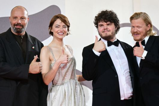 영화 ‘부고니아’를 연출한 요르고스 란티모스 감독이 배우 엠마 스톤·에이든 델비스·제시 플레먼스(왼쪽부터)와 함께 레드카펫에서 포즈를 취하고 있다. [AFP= 연합뉴스] |