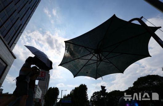[서울=뉴시스] 황준선 기자 = 강남·서초·강동·송파구 등 서울 동남권에 폭염경보가 발효된 25일 오후 서울 송파구 석촌호수 사거리에서 양산을 쓴 시민들이 발걸음을 옮기고 있다. 2025.08.25. hwang@newsis.com |