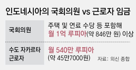 인도네시아는 그간 5%대의 높은 성장률을 이어왔지만 최근 성장이 둔화한 데다 제조업 분야의 일자리 감소 등으로 노동자와 서민의 불만이 높다. 이런 상황에서 하원의원은 주택, 연료, 식료품 수당 등을 포함해 월 1억 루피아(약 846만 원) 이상을 받고 있다. 수도 자카르타의 근로자 월평균 임금인 540만 루피아(약 45만7000 원)보다 약 18.5배 많다. 자카르타 같은 대도시가 아닌 일부 농촌 지역의 평균 임금은 217만 루피아(약 18만3000원)에 불과하다.