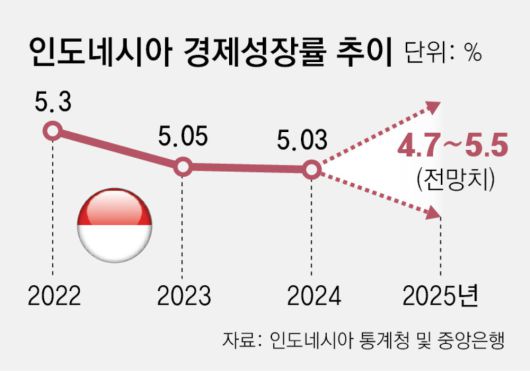 중앙은행, 통계청 등에 따르면 2022~2024년 3년간 5%대를 기록했던 경제 성장률 또한 올해 4%대로 떨어질 가능성이 높다. 프라보워 대통령은 집권 전 8%대 성장을 자신했지만 현실은 큰 차이가 있다.