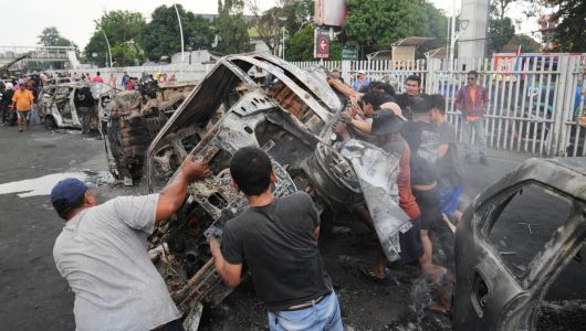 지난달 30일 인도네시아 수도 자카르타에서 국회의원의 고임금 등에 항의하는 반정부 시위대가 불에 탄 차량을 뒤집으며 정부에 대한 분노를 표하고 있다. 이틀 전 시위 현장을 지나던 오토바이 배달 기사 아판 쿠르니아완이 진압에 나선 경찰 장갑차에 깔려 숨지자 시위가 전국적으로 격화되고 있다. 프라보워 수비안토 대통령은 당초 3일 중국 베이징에서 열리는 열병식에 참석할 계획이었지만 취소했다. 자카르타=AP 뉴시스 |
