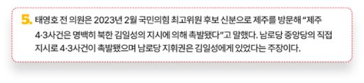 "이렇게 구분해보세요. 탈북민들이 우리나라 와서 역사 교육 받을 때 가장 당황하는 게 '북한에서 배웠던 내용과 똑같네?'하는 지점이 있다는 거거든요. 북한과 같은 걸 가르치는 부분, 바로 그게 좌파 역사관 교육인 겁니다. 4·3을 봐요. (탈북민 출신 전 국회의원인) 태영호 공사가 '4·3은 김일성 지령을 받은 것'이라고 했더니 국회의원들까지 나서 망언이라고 난리였잖아요."(⑤)