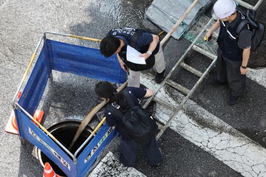 지난달 25일 서울 염창동 맨홀에서 작업자 한 명이 내부로 휩쓸려 가는 사고가 발생, 관계자들이 현장에서 조사를 하고 있다. 연합뉴스 |