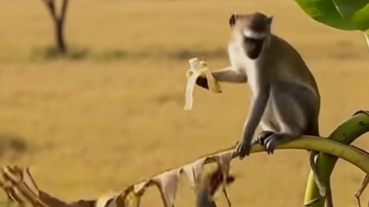 코끼리는 원숭이를 공격하는 치타를 쫓아낸 뒤 바나나 다발을 들고 그 원숭이를 다른 원숭이 무리에게 데려다줍니다.