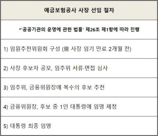 예금보험공사 사장은 임명직이다. 우선 관련 법에 따라 임원추천위원회가 공모와 심사를 거쳐 복수의 후보를 금융위원회에 추천한다.