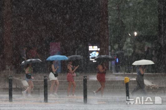 [서울=뉴시스] 권창회 기자 = 지난 13일 서울 중구 시청역 인근에서 시민들이 많은 비에 우산을 쓰고 이동하고 있다. 2025.08.13. kch0523@newsis.com |