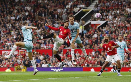 올 시즌 맨체스터 유나이티드에 합류한 마테우스 쿠냐가 번리 수비수와 공중볼 경합에 나선 모습. /로이터·연합
