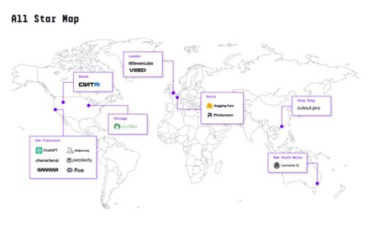 14개 올스타기업들은 AI를 활용한 소비자 행동의 진정한 단면을 보여준다. 일반 지원(챗GPT, 퍼플렉시티, 포우e); 동반자 관계(캐릭터 AI); 이미지 생성(미드저니, 레오나르도); 이미지 및 비디오 편집(비드, 컷아웃); 음성 생성(일레븐 랩스); 생산성 도구(포토룸, 감마, 퀼봇); 모델 호스팅(씨비타이, 허깅 페이스)였다.
