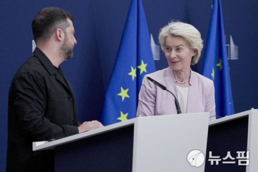 17일(현지시간) 벨기에 브뤼셀에서 공동 기자회견 하는 볼로디미르 젤렌스키 우크라이나 대통령(좌)과 우르줄라 폰데어라이엔 유럽연합(EU) 집행위원장. [사진=로이터 뉴스핌] |