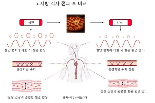 뇌에도 안 좋은 징후가 나타났다. 젊은이와 노인 모두에게서 뇌의 혈류 조절 능력(동적 뇌 자가조절)이 약해진 것으로 나타났다. 특히 노년층에선 10%나 약해졌다. 뇌혈관이 그만큼 더 딱딱해졌다는 뜻이다. 이는 노년층의 뇌가 지방 식단에 더 취약하다는 걸 시사한다.