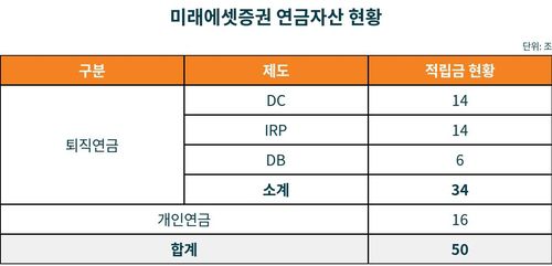 (서울=연합뉴스) 황철환 기자 = 미래에셋증권[006800]은 자사가 운용하는 연금 자산이 50조원을 돌파했다고 1일 밝혔다.