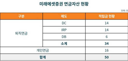 미래에셋증권은 퇴직연금 34조원(8월 27일 기준), 개인연금 16조원으로 연금자산이 50조원을 넘어섰다고 1일 밝혔다. 납입 원금 대비 평가 차익은 약 8조4000억원(7월 말 기준)을 기록했다. 미래에셋증권의 연금 고객들이 누적 8조4000억원의 수익을 거뒀다는 의미다.