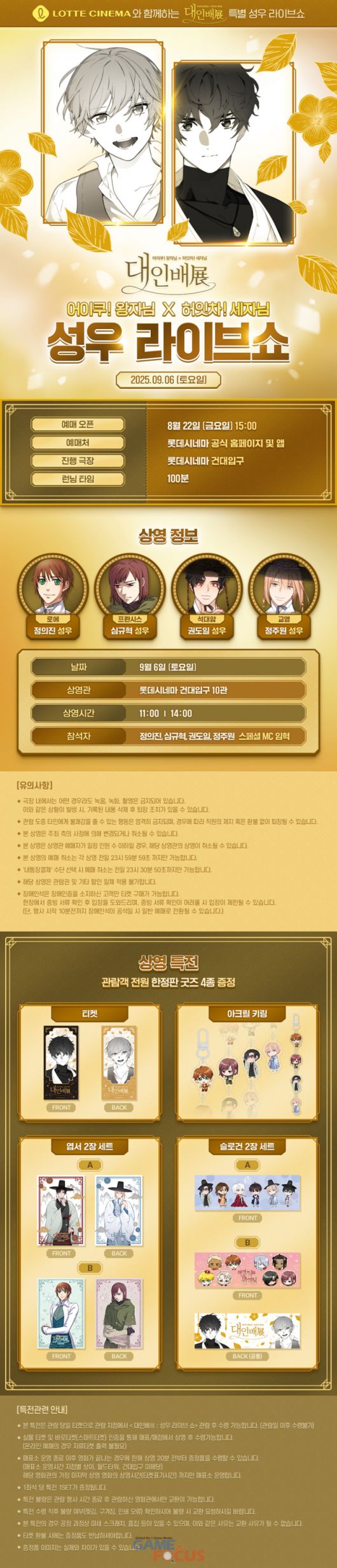 성우들의 다양한 비하인드 스토리가 기대되는 이번 라이브쇼는 사전에 예매한 사람만 참여할 수 있으며, 대인배들은 이번 라이브쇼를 관람하는 대상자들을 위해 특별한 티켓 굿즈를 포함해 다양한 선물을 제공할 예정이다.