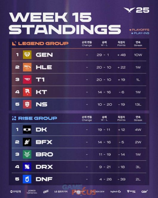 마지막 날 마지막 경기에서 넥서스가 파괴될 때까지 결과를 알 수 없었던 2025 LCK 정규 시즌이 막을 내리며 레전드 그룹과 라이즈 그룹의 최종 순위가 확정됐다. 레전드 그룹에서는 T1과 한화생명e스포츠가 마지막까지 2위 경쟁을 벌인 끝에 한화생명e스포츠가 2위 자리를 되찾았고 라이즈 그룹에서는 OK저축은행 브리온이 플레이-인 마지막 티켓을 확보했다.T1과 한화생명e스포츠는 정규 시즌 마지막 주차를 앞두고 19승 9패로 동률을 이루며 팽팽한 2위 싸움을 이어갔다. T1은 27일(수) 한화생명e스포츠와의 경기에서 2대1로 승리, 세트 득실 1점 차로 2위에 올라섰다. 그러자 한화생명e스포츠도 곧장 성과를 냈다. 한화생명e스포츠가 29일(금) 농심 레드포스를 2대0으로 꺾으며 다시 한 번 순위가 뒤바뀌었다. T1이 2위 자리에 오르기 위해서는 30일(토) 젠지를 반드시 꺾어야 했지만 젠지의 벽은 높았다. T1은 정규 시즌 마지막 경기에서 젠지에게 1대2로 패하며 한화생명e스포츠와 20승 10패로 승패가 같았으나 세트 득실 3점 차이로 뒤처지면서 레전드 그룹 3위로 정규 시즌을 마무리했다.