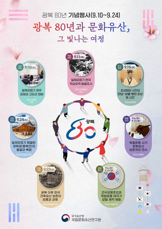 국가유산청 국립문화유산연구원은 광복 80주년의 의미를 되새기기 위해 이달 10일부터 2주간 고고·건축·미술·보존과학 분야에서 학술대회, 전시 및 체험, 시민강좌 등 다채로운 행사 7건을 개최한다고 1일 밝혔다.