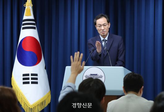 우상호 대통령실 정무수석이 지난달 28일 서울 용산 대통령실 청사에서 ‘국민 임명식’ 관련 브리핑을 하며 취재진의 질문을 받고 있다. 대통령실사진기자단 |