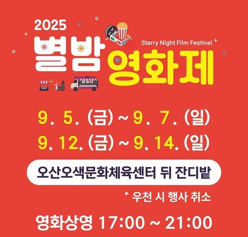 (오산=연합뉴스) 경기 오산시는 오는 5일부터 14일까지 매주 금·토·일 저녁 오산천(오색문화체육센터 뒤편)에서 시민들이 야외에서 무료로 영화를 즐길 수 있는 '2025 오산천 별밤영화제'를 개최한다고 1일 밝혔다.