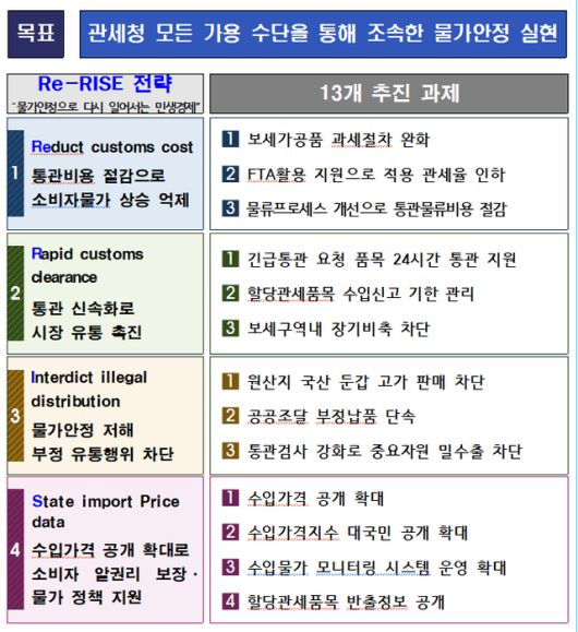 ㅇ 아울러 “매월 추진실적을 점검하고 보완대책을 마련하여, 민생경제가 회복될 때까지 물가안정을 위해 관세청의 모든 가용 수단을 총동원하겠다”고 강조했다.