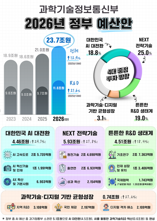 [디지털투데이 이진호 기자] 과학기술정보통신부는 2026년도 정부 예산안 및 기금운영계획안에 반영된 과기정통부 예산안이 총 23조7000억원으로 편성됐다고 1일 밝혔다.