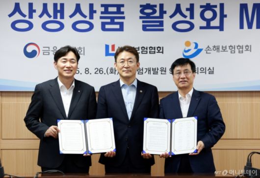 [서울=뉴시스] 이영환 기자 = 권대영(가운데) 금융위원회 부위원장이 26일 오후 서울 영등포구 보험개발원에서 열린 보험업권 상생상품 활성화 MOU 체결식에 참석해 김철주(오른쪽) 생명보험협회 회장, 이병래 손해보험협회 회장과 기념촬영을 하고 있다. 2025.08.26. 20hwan@newsis.com /사진=이영환 |