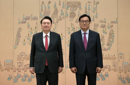 윤석열(왼쪽) 전 대통령이 지난해 4월 24일 서울 용산 대통령실 청사에서 정진석 전 비서실장에게 임명장을 수여한 후 기념촬영을 하고 있다. 대통령실사진기자단 |