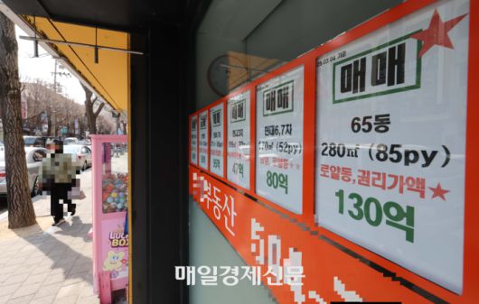 서울 강남구 한 부동산 외벽에 붙은 매물판에 아파트 매매 호가가 쓰여 있다. [한주형 기자] |