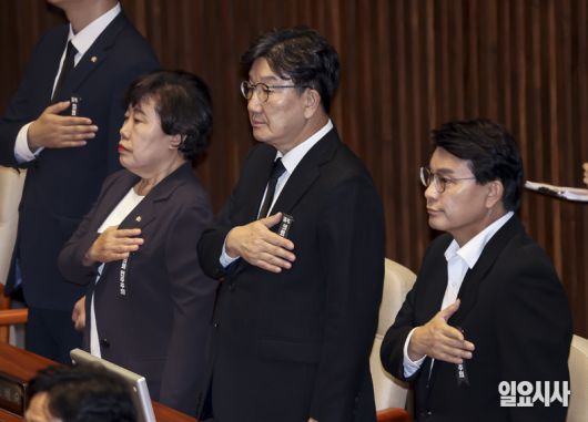 ⓒ일요시사 국민의힘 조배숙, 권성동, 윤상현 의원이 1일 오후 서울 여의도 국회에서 열린 정기국회 개회식에서 상복 차림으로 국민의례를 하고 있다. 여야 갈등이 심화되는 상황에서 우원식 국회의장은 개회식에 한복을 입자고 제안했다. 한편 국민의힘 의원들은 여당의 입법 독주에 항의하는 의미로 검정 양복과 근조 리본 등 '상복 차림'으로 개회식에 참석했다. 일요시사=고성준 기자(joonko1@ilyosisa.co.kr) <joonko1@ilyosisa.co.kr> 저작권자 ©일요시사 무단전재 및 재배포 금지