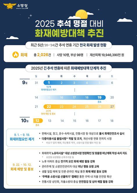 긴 연휴 동안 귀성·귀경객이 늘며 집을 비우는 일이 많아지고, 다중이용시설 이용 등에 따른 화재 위험이 높아지는 만큼 화재 예방 및 인명·재산 피해를 최소화하기 위한 것이다.