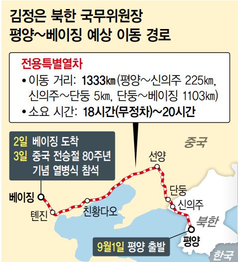 목적지인 베이징에 도착하기 전 북·중 국경역인 단둥역을 포함해 중국 구간에서 김 위원장의 방중 환영행사가 열릴 수도 있다. 단둥에서 베이징까지 1103㎞는 중간에 서지 않는다면 13시간30분 정도 걸린다. 방탄인 김 위원장의 전용열차는 평균 시속 45~50㎞ 정도로 운행한다.