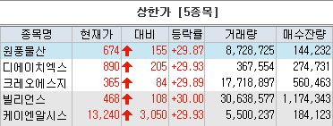 이 밖에 원풍물산, 디에이치엑스컴퍼니 등이 상한가로 장을 마쳤다.