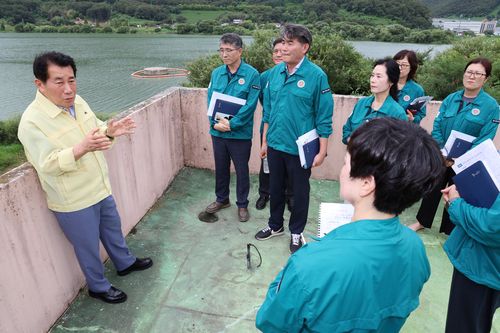 ▲ 나동연 경남 양산시장은 최근 낙동강 일대 녹조 발생과 관련해 1일 신도시 취수장과 정수장을 찾아 현장 점검을 벌였다. 나 시장은 "녹조는 자연현상으로 볼 수 있지만 시민 안전과 직결되는 문제인 만큼 결코 소홀히 할 수 없다"며 "수질 모니터링 강화 등을 통해 어떤 상황에서도 시민이 안심하고 마실 수 있는 깨끗하고 안전한 수돗물을 공급하겠다"고 말했다. (양산=연합뉴스)