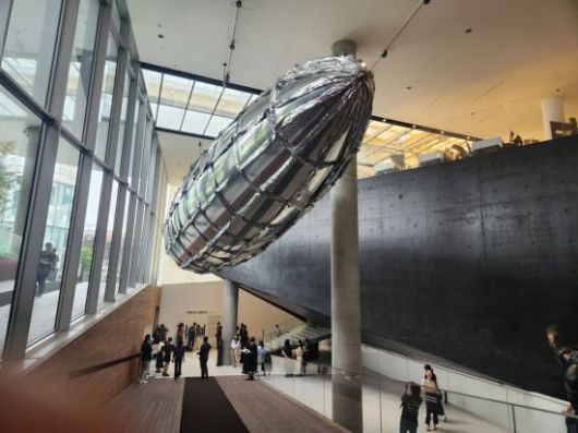 리움미술관에서 열리는 이불 작가의 서베이 전시 '이불: 1998년 이후' 내부 전경. 전시관 입구에서 17m 길이의 은빛 비행선을 형상화한 '취약할 의향-메탈라이즈드 벌룬'(2020) 작품이 시선을 사로잡는다. 서믿음 기자 |