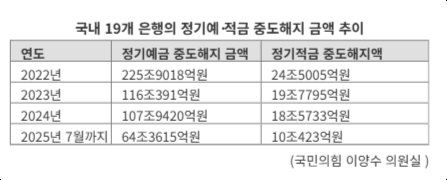 2022년의 경우 금리가 급격하게 인상되면서 더 높은 금리로 예·적금을 갈아타는 수요가 많았다. 하지만 본격적인 금리인하기에는 정기예·적금 금리가 계속 하락하기 때문에 목돈이나 급전이 필요해 이자를 포기하고 중도해지에 나섰을 것이라는 지적이다.