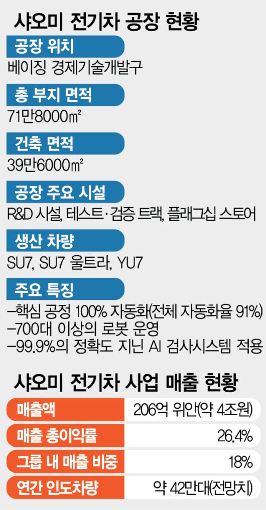 높은 자동화율을 바탕으로 샤오미는 수익성을 빠르게 끌어올렸다. 올해 2분기 샤오미의 전기차 부문 매출총이익률은 26.4%로 테슬라의 17.2%를 앞선다. 연간 15만 대 캐파로 설계된 슈퍼팩토리는 6월 YU7 판매를 기점으로 2단계 가동에 들어가 현재 연산 40만 대 규모까지 확장한 상태다. 최근 샤오미는 레이 회장이 올해 목표로 제시한 35만 대를 넘어 연간 판매량이 42만 대에 달할 것으로 자신하고 있다.
