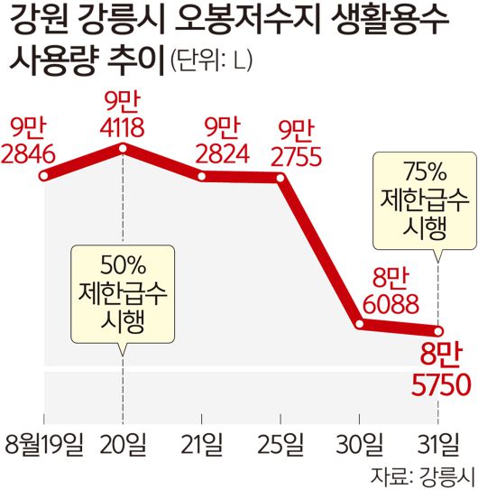 1일 강릉시에 따르면 전날 강릉 지역 하루 생활용수 사용량은 8만5750ℓ다. 주요 식수원인 오봉저수지 저수율이 25% 밑으로 떨어져 50% 제한급수를 시작한 지난달 20일(사용량 9만4118ℓ)보다 8% 감소하는 데 그쳤다. 제한급수가 시작되면 생활용수 사용량이 5만ℓ 수준으로 떨어질 것이란 시 예상이 크게 빗나갔다.