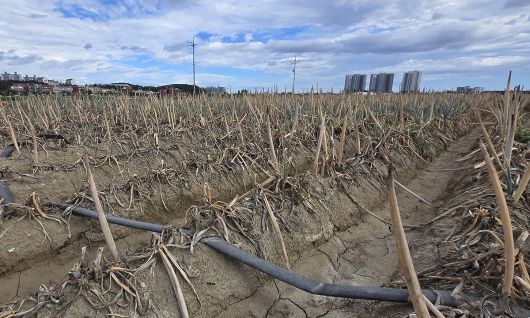 최악 가뭄에 농업용수 공급이 중단된 가운데 1일 강원 강릉시 한 대파밭에 심어진 파가 말라가고 있다. 연합뉴스 |