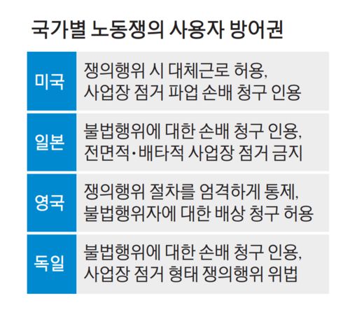 그러나 김 장관의 해명과 달리 해외 입법 사례는 불법 쟁의행위에 대해 명확히 손해배상책임을 묻는 경우가 대부분인 것으로 나타났다. 미국은 단체교섭 범위를 폭넓게 보장하지만, 파업 시 대체근로를 허용하고 사업장 점거 파업에 대해서는 손해배상 청구를 인정한다.