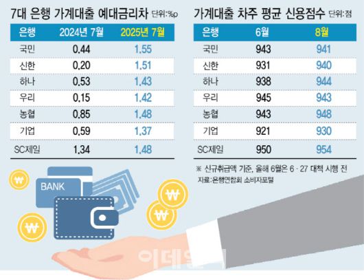 차주의 평균 신용점수는 지난달 기준 943점에 달했다. 그만큼 은행이 초우량 차주 위주로 대출을 내주고 있다. 은행연합회 공시에 따르면 6·27대책 시행 전인 6월 7대 은행의 가계대출 차주 평균 신용점수는 938.71점이었는데 8월에는 942.86점으로 4점 이상 올랐다.