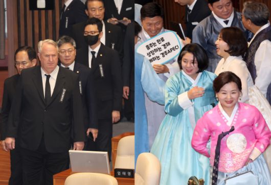 제22대 국회 정기국회가 1일 개회한 가운데, 국민의힘 의원들이 검정 양복과 검정 넥타이에 근조 리본을 단 ‘상복 차림’으로 본회의장에 참석해 눈길을 끌었다.