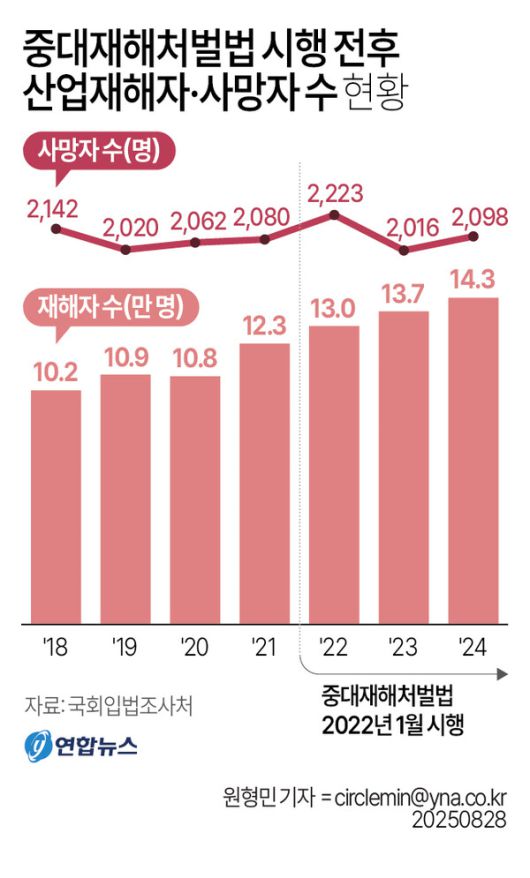 중대 재해를 예방하고 시민과 종사자의 생명과 신체를 보호함을 목적으로 2021년 1월 26일 제정된 「중대재해 처벌 등에 관한 법률(중대재해처벌법)」을 2022년 1월 27일 시행한 지 3년이 넘게 지나갔지만, 산업재해로 인한 사망자 수가 줄어들지 않고 재해자 수는 되레 늘어난 것으로 나타났다. 국회입법조사처가 지난 8월 28일 발표한 '중대재해처벌법 국내 첫 입법 영향 분석 내용 및 결과' 제하의 보고서에 따르면 국회입법조사처가 전체 사건(1,252건)을 전수조사한 결과, 73%(917건)가 "수사 중"인 것으로 확인됐다. '중대재해처벌법' 위반 사건 상당수가 미해결 상태로 남아있어, 입법 3년 차가 되도록 법의 취지가 달성되지 못하고 있다.