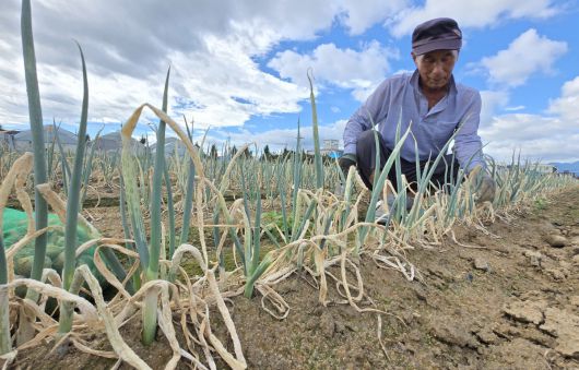 고개 숙인 대파…타들어가는 ‘농심’ 강원 강릉시에 최악의 가뭄이 계속되면서 농업용수 공급이 중단된 가운데 강릉의 농민이 1일 대파밭에서 말라가는 작물의 상태를 살펴보고 있다. 연합뉴스