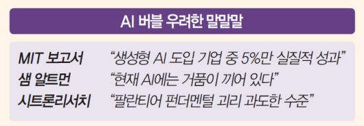 이뿐 아니다. 매사추세츠공과대학(MIT)이 최근 발간한 보고서(STATE OF AI IN BUSINESS 2025)도 AI에 부정적이다. MIT는 AI 기업 임원 150명과 직원 350명을 대상으로 설문조사하고 300개의 AI 프로젝트를 분석했다. 그 결과 AI 프로젝트 95%는 측정할 수 있는 재정적 비용 절감 효과나 기업 수익 증가로 이어지지 못한 것으로 나타났다. 기업들이 생성형 AI에 300억~400억달러를 투자했다는 것을 고려하면 해당 보고서 시사점은 적지 않다.