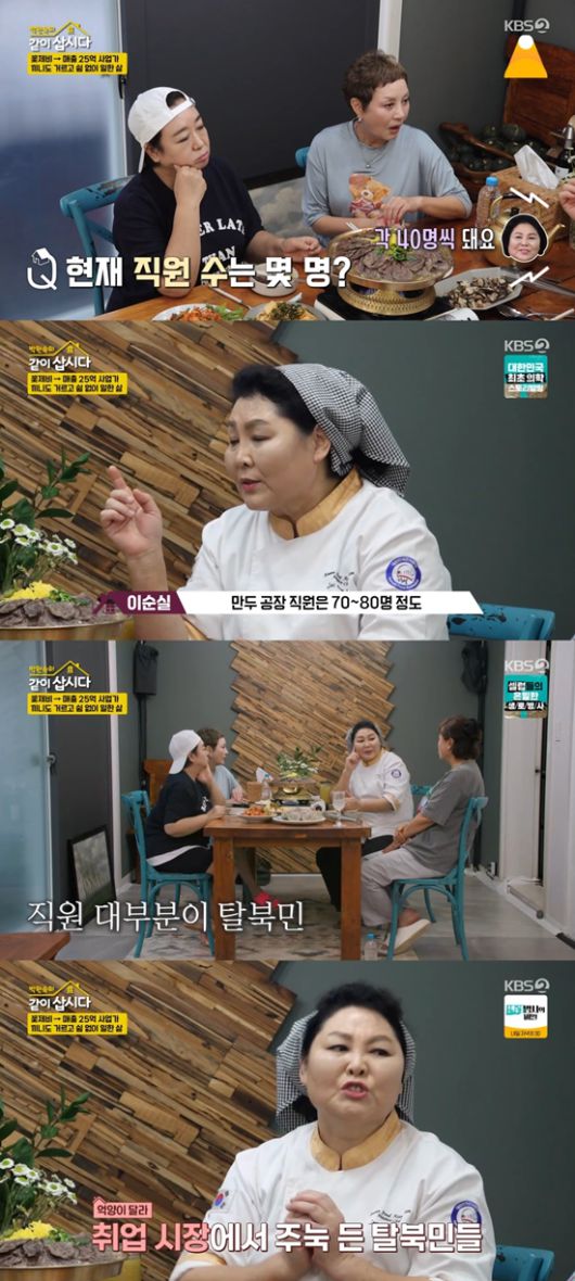 홍진희는 이순실에게 "직원이 총 몇 명이냐?"라고 물었다. 이순실은 "각 40명씩 된다. 만두 공장 직원은 7~80명으로 탈북민 일자리 창출 때문에 다 탈북민이다. 탈북민들이 아무리 자신감을 가지고 나왔어도 한국 분들이 일하는 회사로 가면 주눅이 든다"라고 답했다.