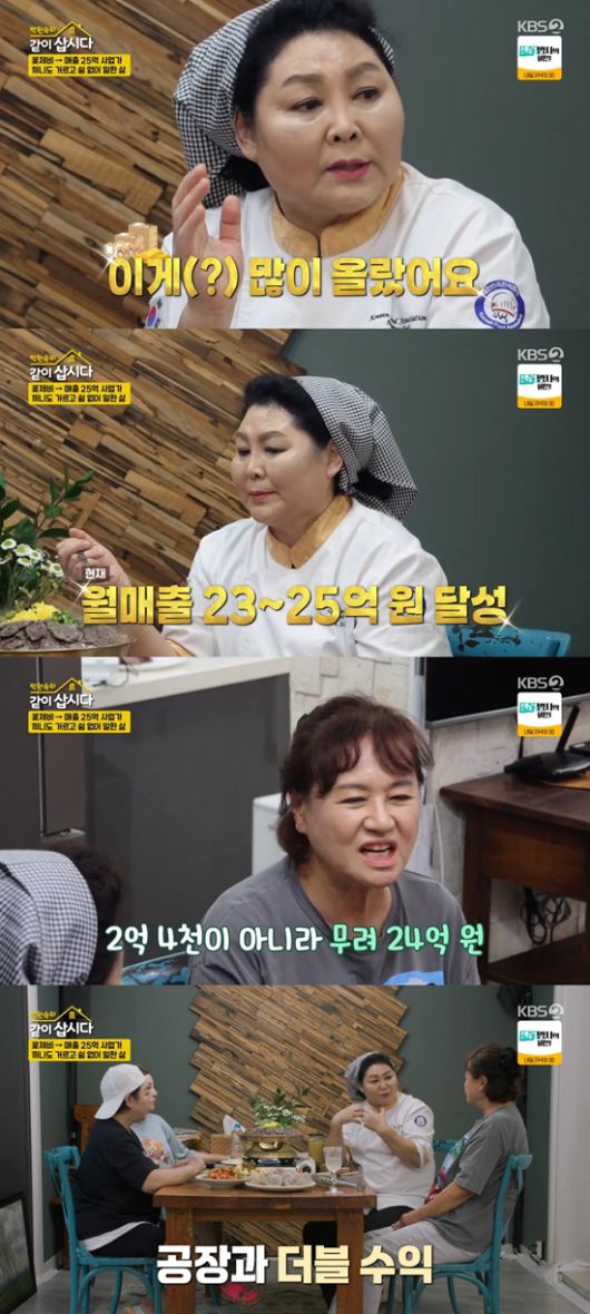 이날 방송에서 이순실은 "영덕에서 촬영한 이후로 (매출이) 많이 올랐다. (한 달 매출이) 23억에서 25억까지 왔다 갔다 했다"라고 밝혔다. 이에 박원숙은 "2억 4천이 아니라 24억이다"라며 감탄했다.