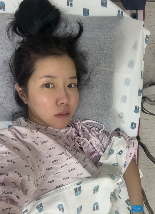 사진 속 김지혜는 병원 침대에 누워 각종 검사를 하고 다소 긴장된 표정을 짓고 있다.