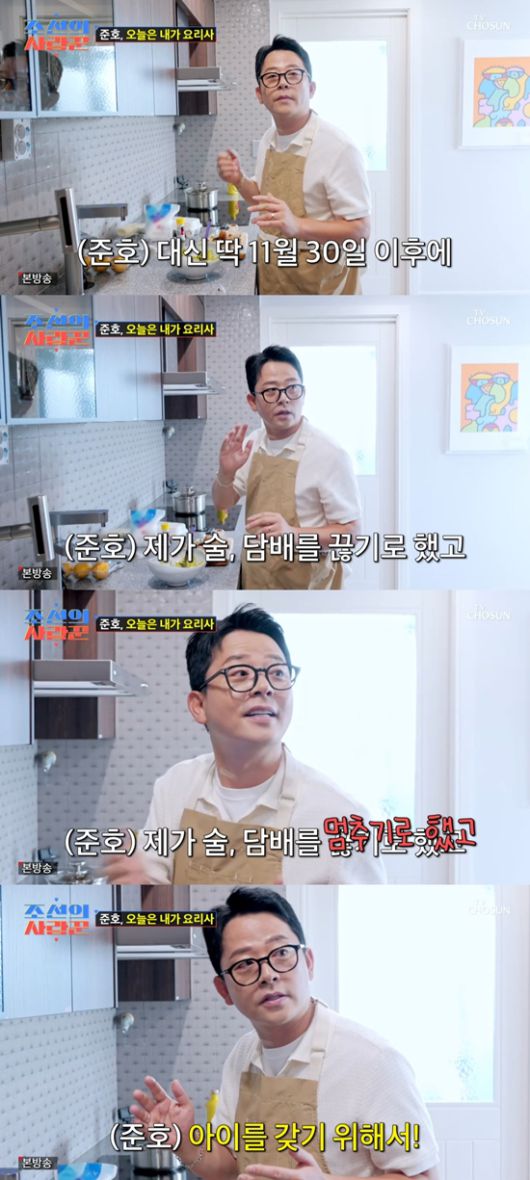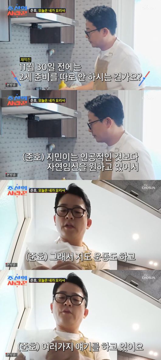 김준호는 "대신 11월 30일 이후로는 제가 술, 담배를 끊기로 했다. 아기를 갖기 위해 끊는 게 아니라 1년 멈추는 거다. 지민이도 술을 절대 안 먹겠다고 했다"라며 2세 계획을 공개했다. 제작진이 "11월 30일 전에는 2세 준비를 따로 안 하냐?"라고 묻자, 김준호는 "지민이는 사실 인공적인 것보다 자연임신을 원하고 있다. 그래서 운동도 하고 여러가지 얘기를 하고 있다. 운명적으로 생기면 좋은 거다"라고 답했다.