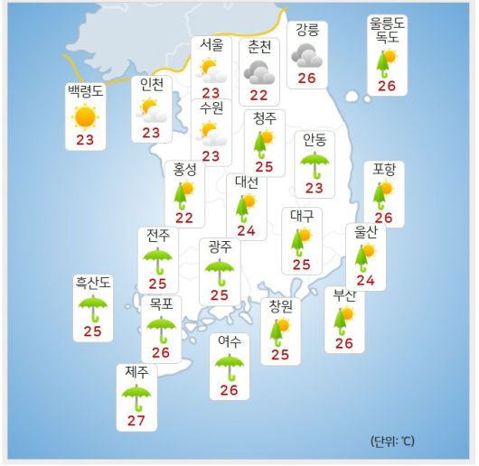 최고기온은 △서울 32도 △인천 30도 △춘천 32도 △강릉 30도 △대전 30도 △대구 32도 △전주 30도 △광주 31도 △부산 32도 △제주 31도 △울릉도 독도 29도로 예상된다.