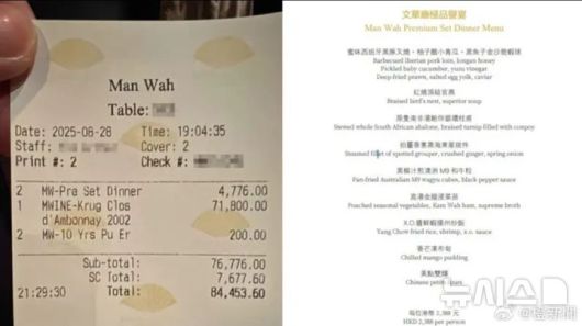 홍콩 온라인 커뮤니티에는 실제 계산서로 보이는 영수증이 확산됐다. 해당 영수증에 따르면 두 사람은 호텔의 최고급 코스 요리인 '극품예연(極品譽宴)'을 주문했다.