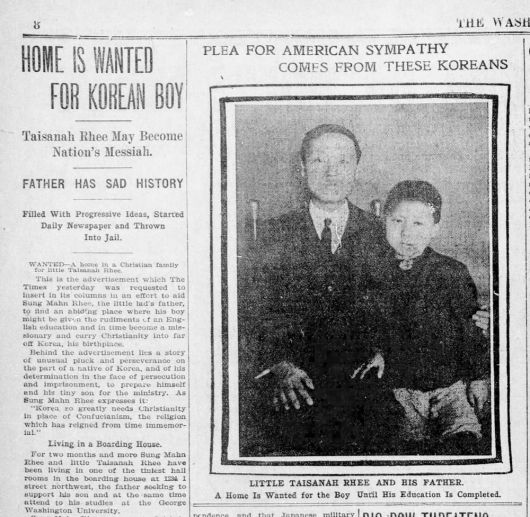 1905년 6월 4일 워싱턴타임스에 2단 크기의 사진과 함께 기사가 실렸다. ‘한국 소년을 위한 가정을 찾습니다(Home is wanted for Korean boy)’란 제목이었다. 한국 소년이란 바로 태산이었다. 부친 이승만과 함께 촬영한 사진 속 태산이는 머리를 짧게 깎고 미국식 옷을 입은 채 아버지의 팔에 안겨 있다. 이 기사에서 이승만은 ‘나의 학업이 끝날 때까지 이 아이를 맡아줄 기독교 가정을 찾는다’고 했다. 아들에 대한 교육의 목적을 분명히 밝힌 대목이 주목된다. “교육을 끝마칠 때까지 미국에 머물도록 할 것이지만 그 이후에는 고국을 떠나 있지 않을 것입니다.”