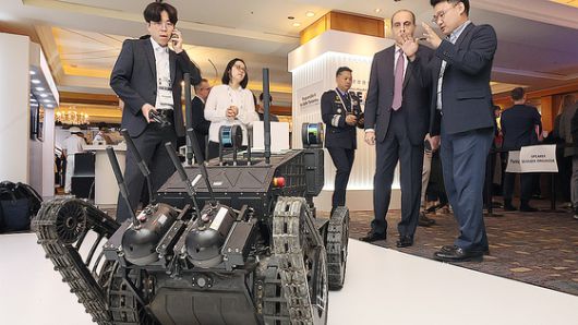 지난해 9월 9일 서울 중구 롯데호텔에서 열린 ‘2024 인공지능의 책임 있는 군사적 이용(REAIM)’에 관한 고위급 회의장 앞에 국방과학연구소의 자율터널 탐사 로봇이 전시돼 있다. 연합뉴스 |